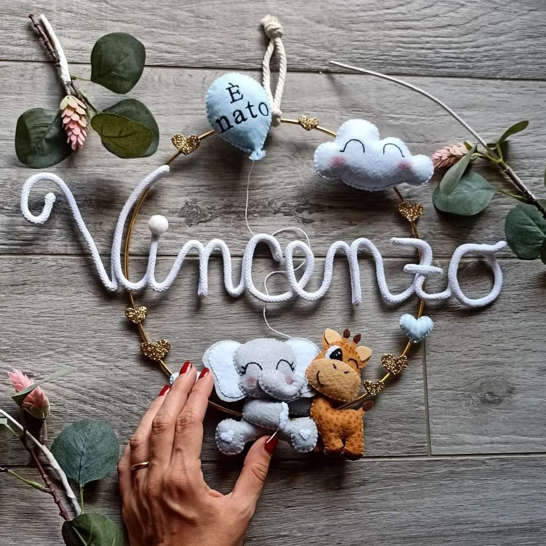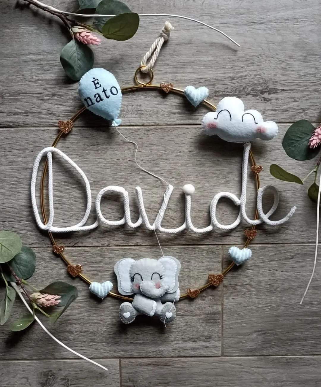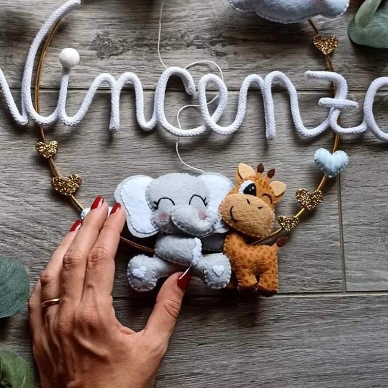 Personalizzalo con il nome del tuo bambino realizzato in corda, su una base rigida con l'animale di cui sei più innamorato.