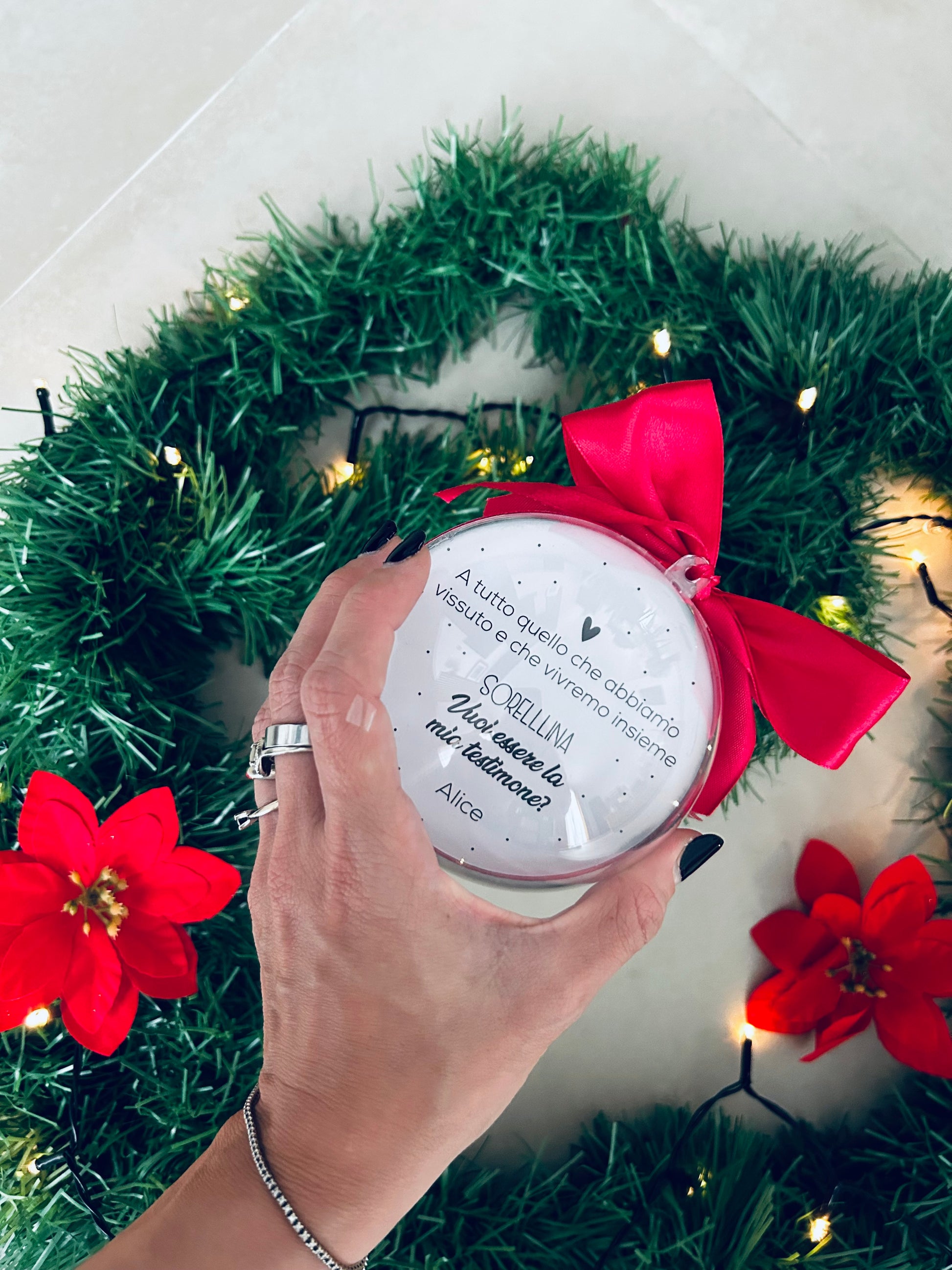 Un regalo unico per il Natale e per chiedere di essere testimone nel tuo giorno speciale. Stupisci chi ami con questa pallina speciale.