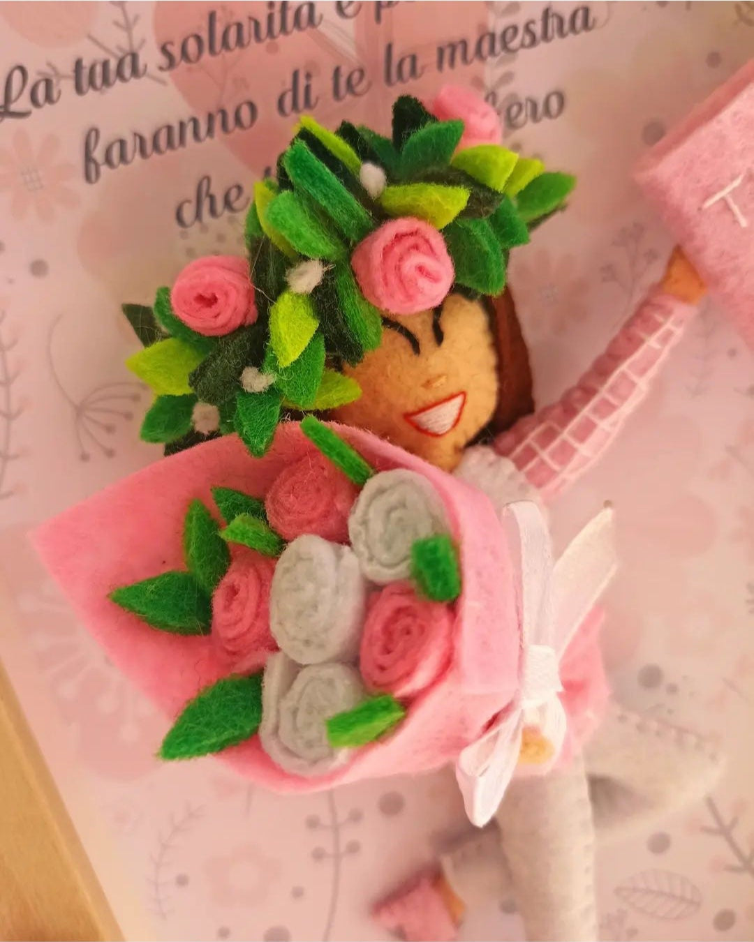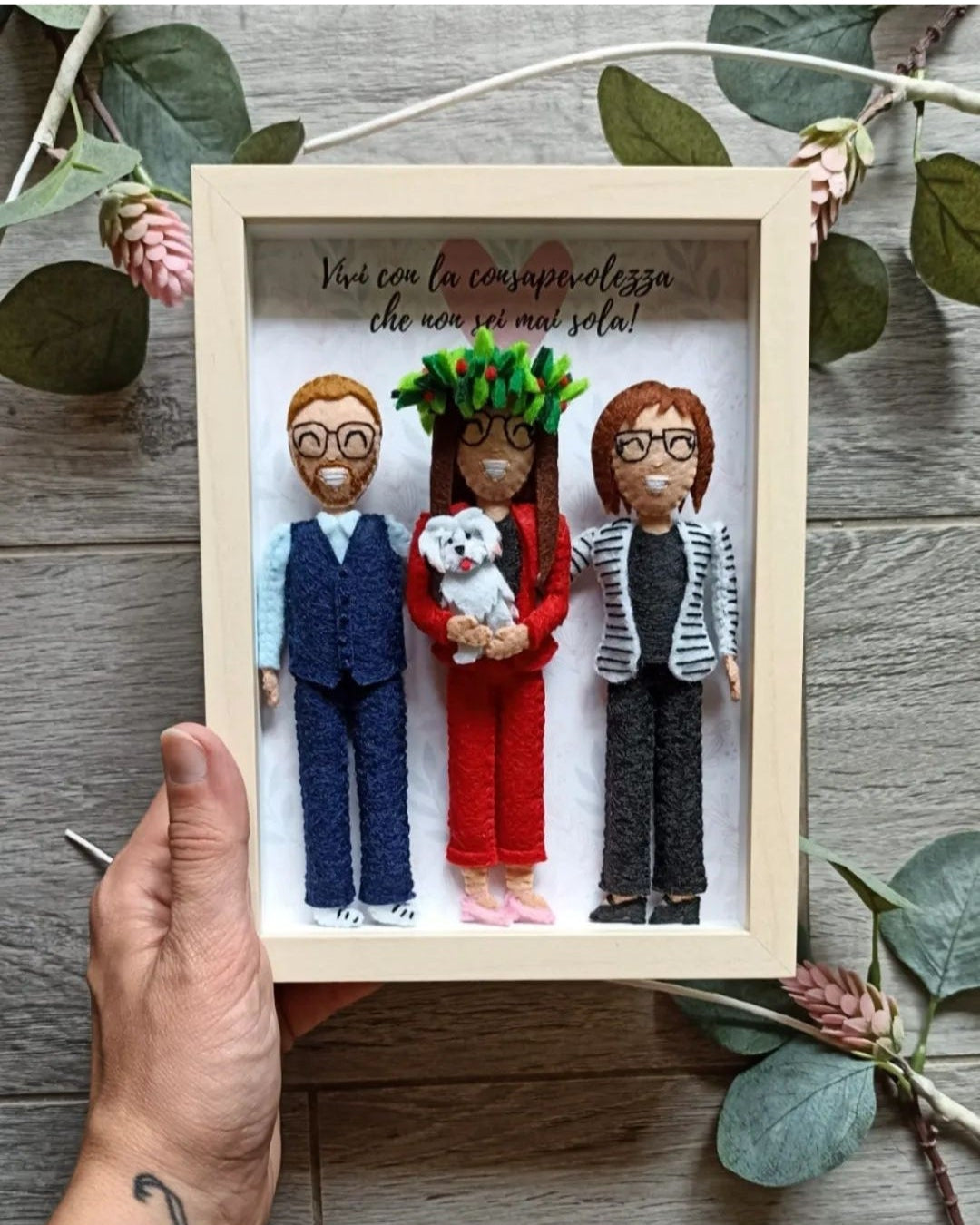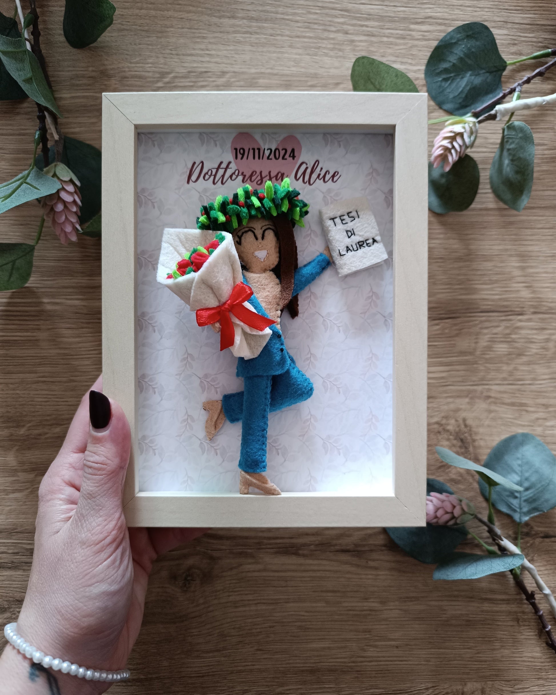 Il costo comprende: il quadretto (dimensione interna 13x18cm), lo sfondo a scelta tra quelli disponibili (trovi le opzioni tra le foto), una frase da inserire sullo sfondo, un personaggio in feltro