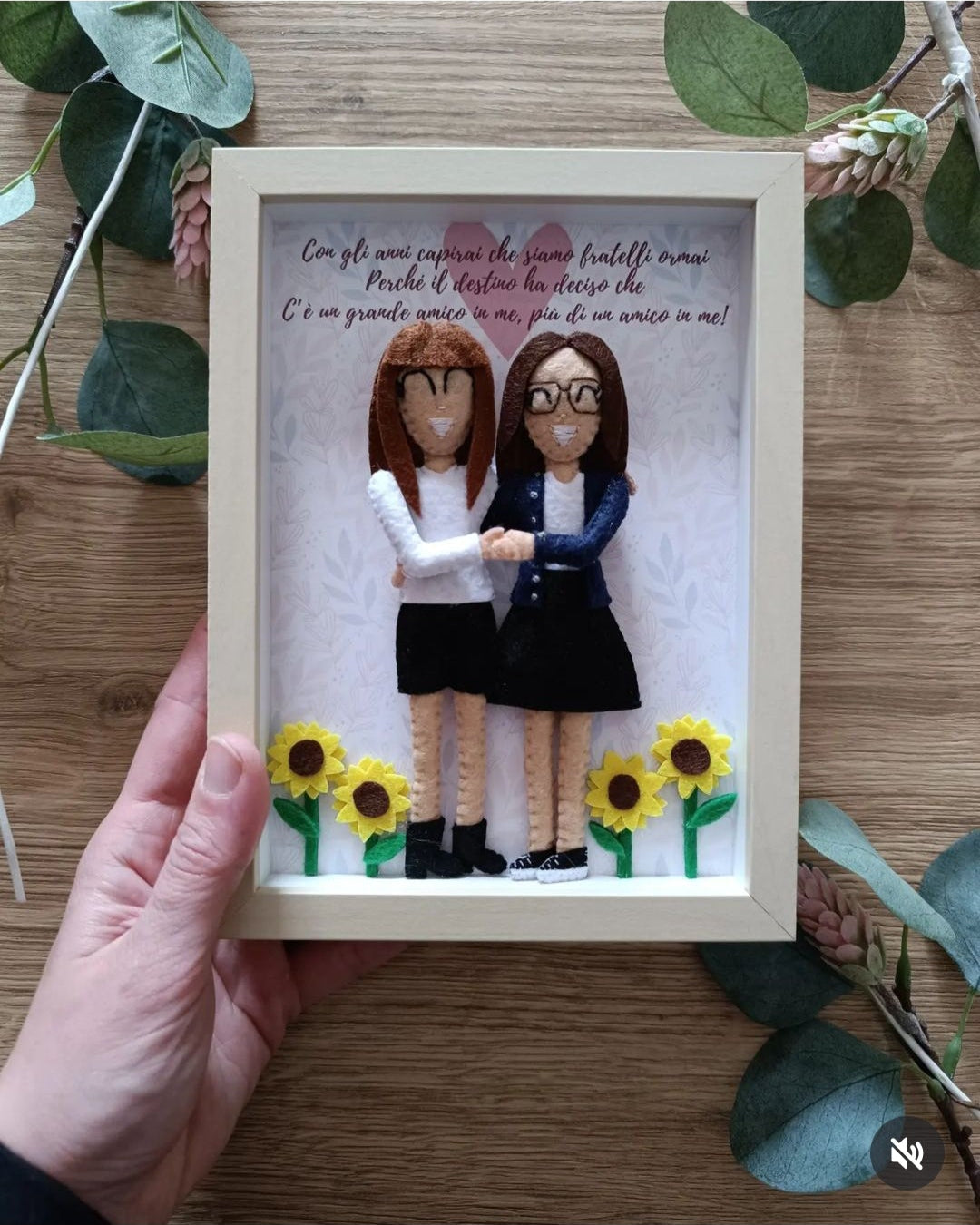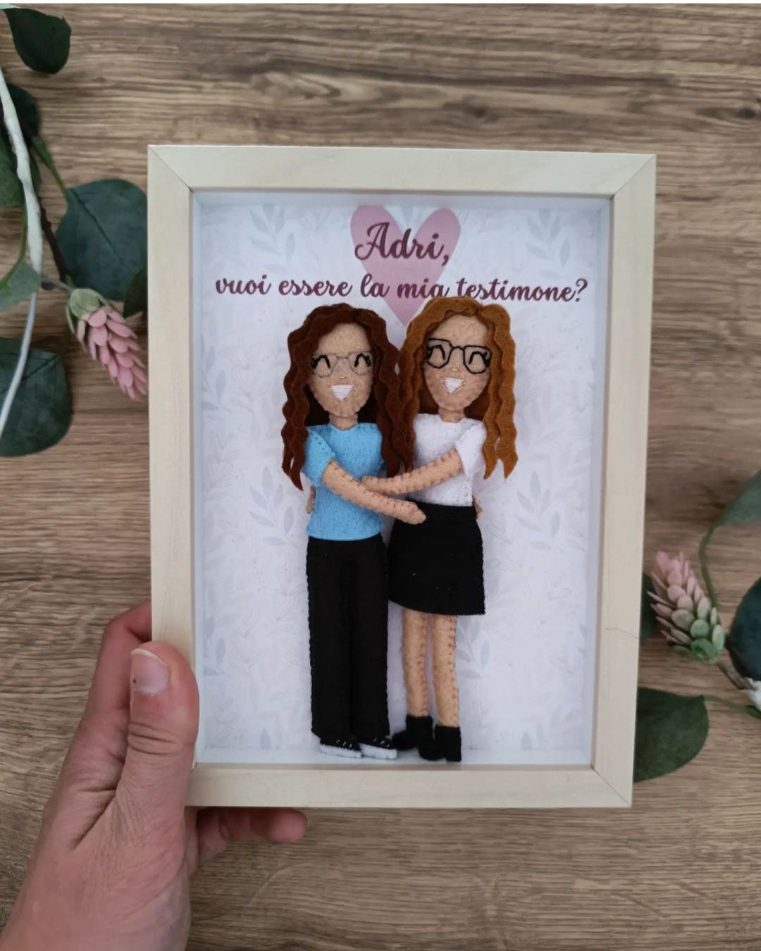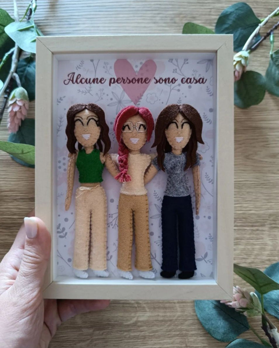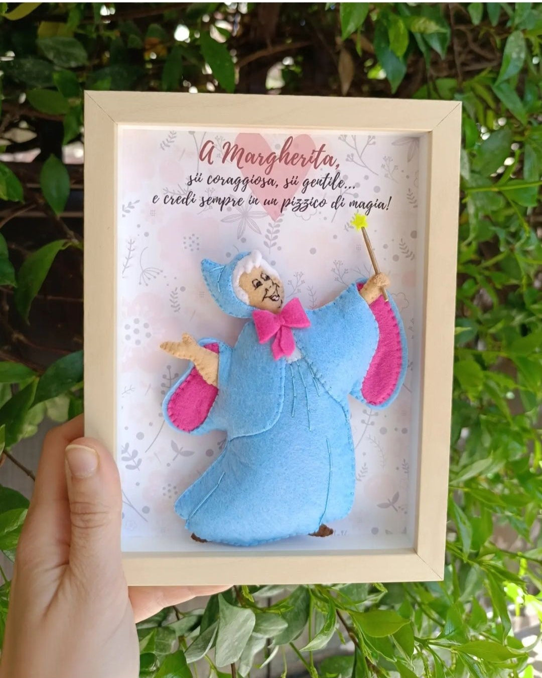 Il costo comprende: il quadretto (dimensione interna 13x18cm), lo sfondo a scelta tra quelli disponibili (trovi le opzioni tra le foto), una frase da inserire sullo sfondo, un personaggio in feltro.