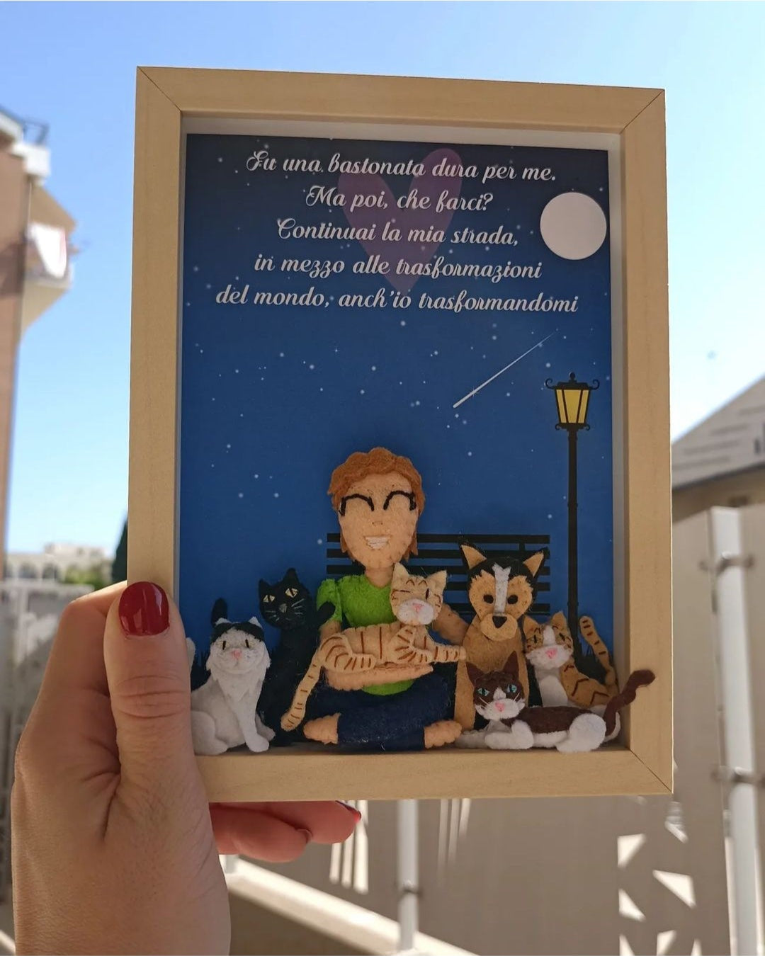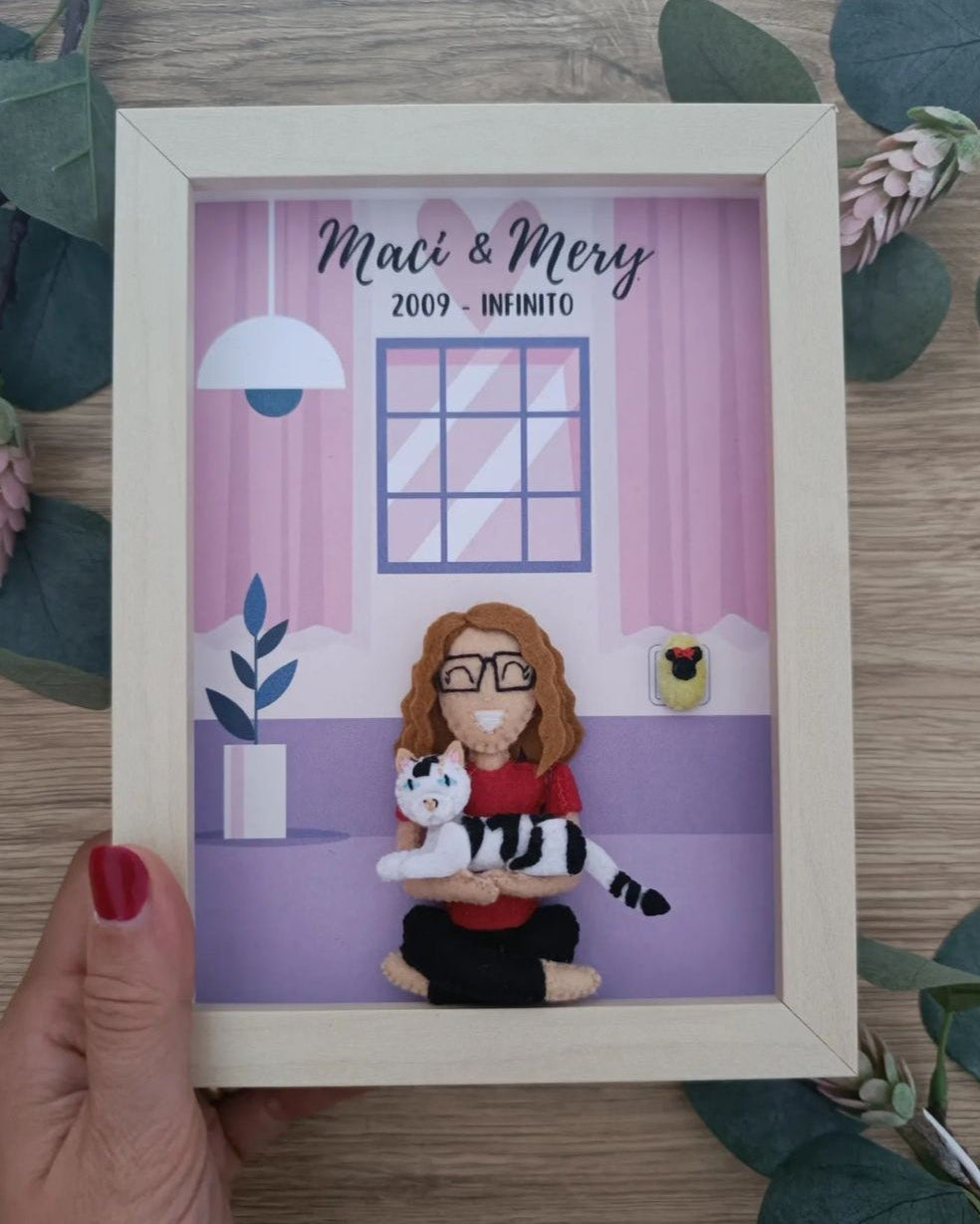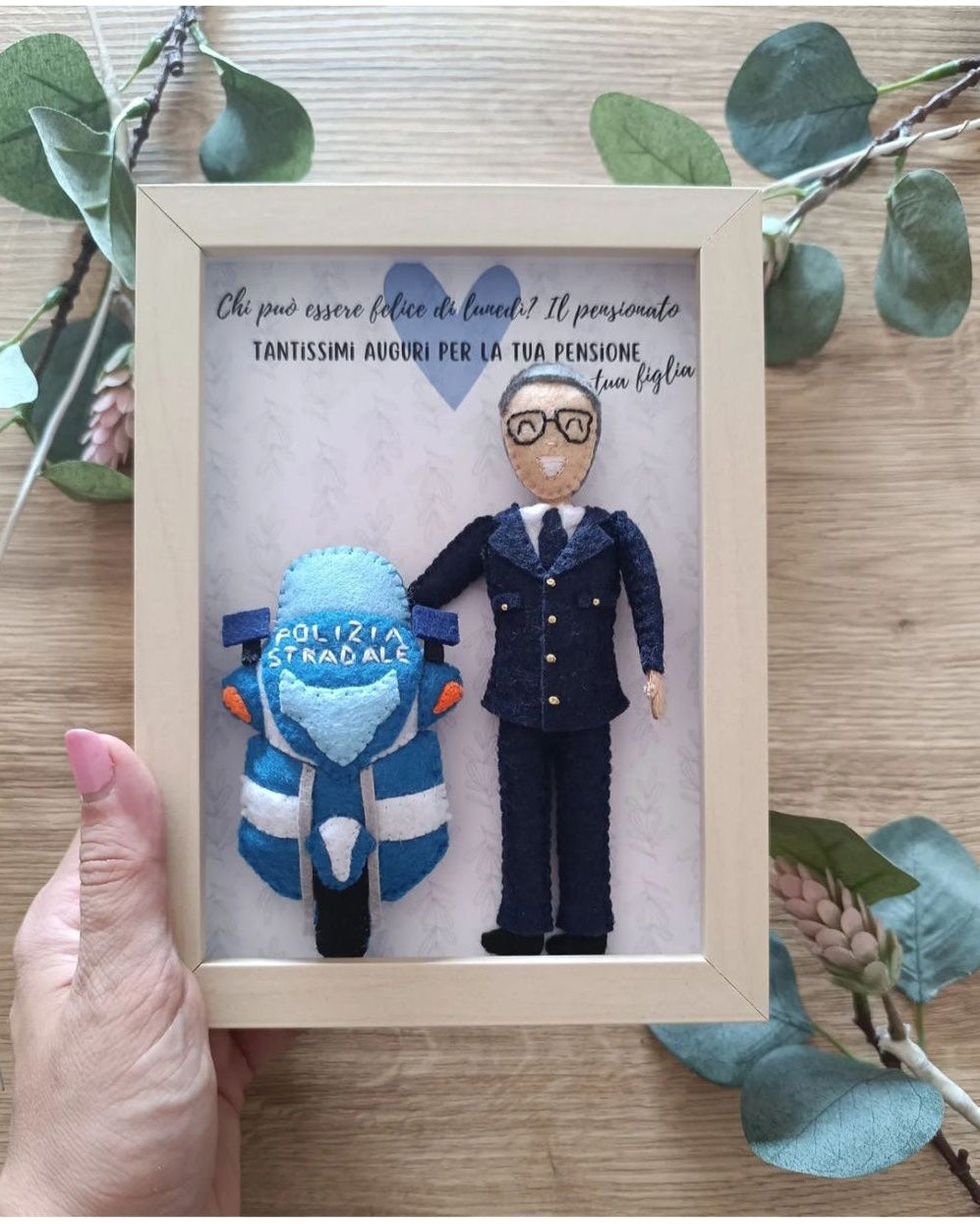 Il costo comprende: il quadretto (dimensione interna 13x18cm), lo sfondo a scelta tra quelli disponibili (trovi le opzioni tra le foto), una frase da inserire sullo sfondo, un personaggio in feltro.