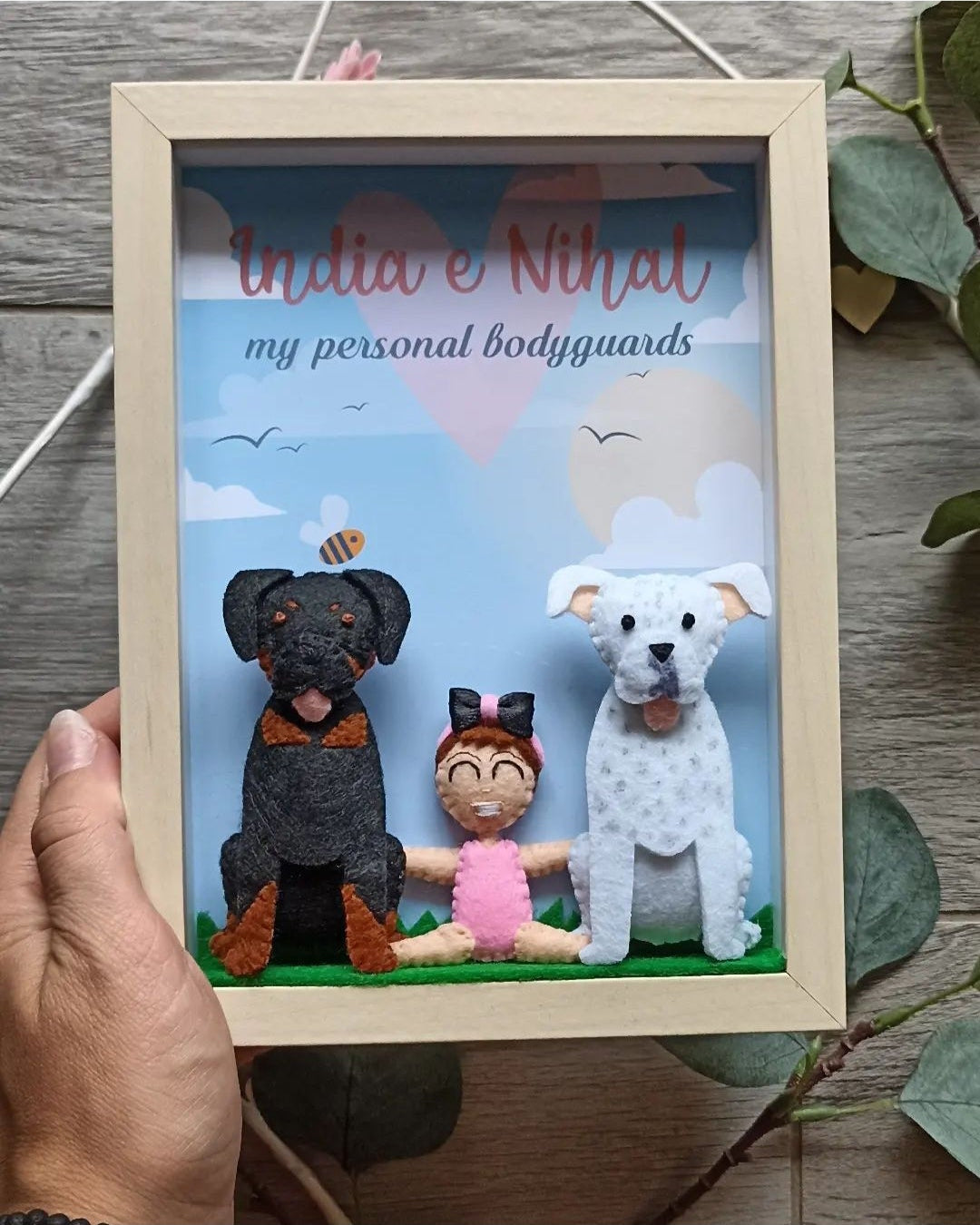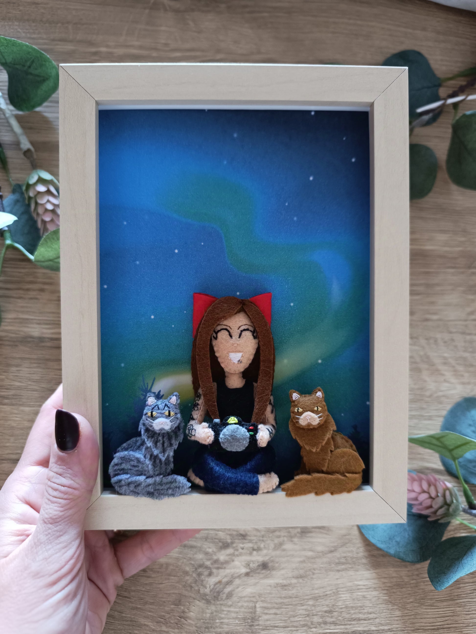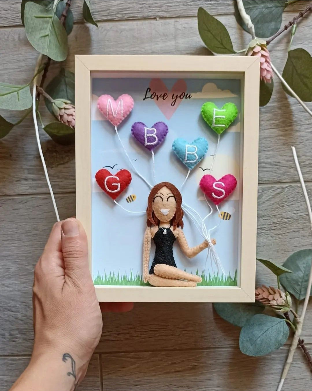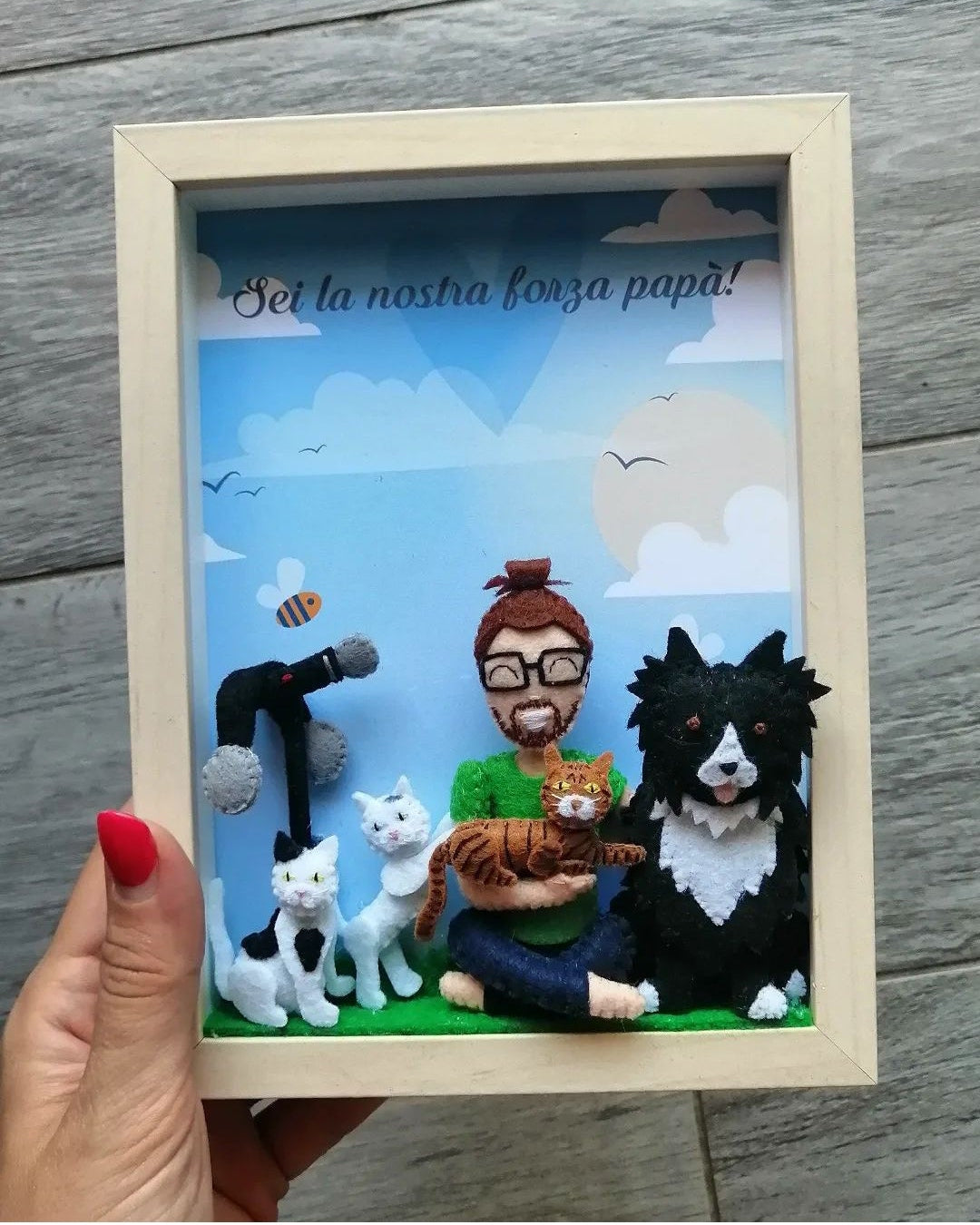 Il costo comprende: il quadretto (dimensione interna 13x18cm), lo sfondo a scelta tra quelli disponibili (trovi le opzioni tra le foto), una frase da inserire sullo sfondo, un personaggio in feltro.