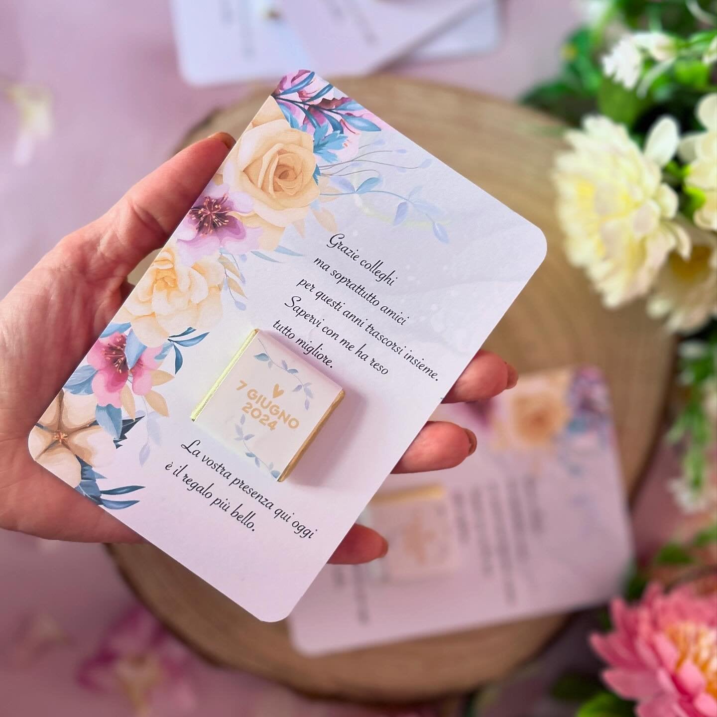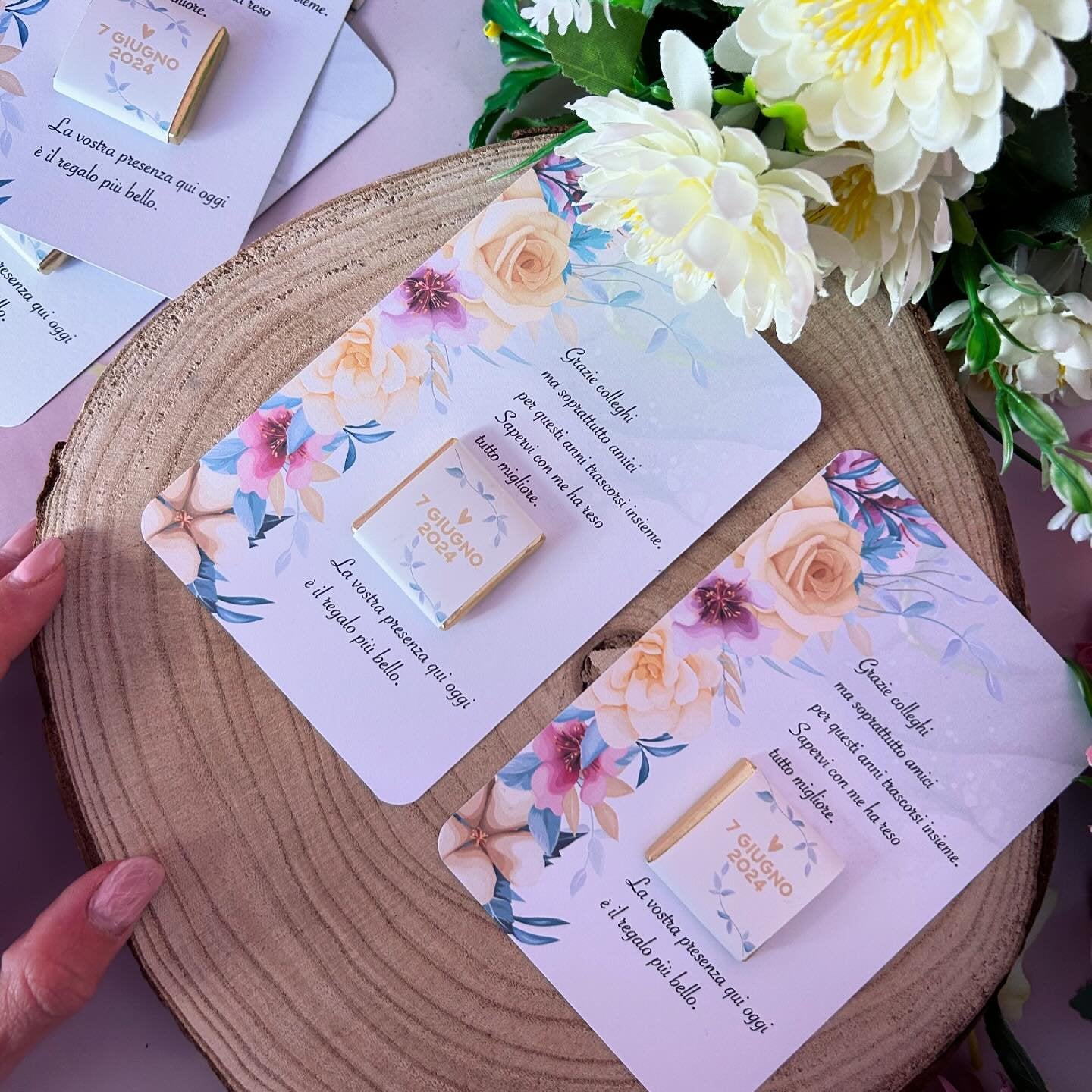 Questi cartoncini personalizzati con cioccolatino sono ideali per festeggiare il tuo evento, offrendo un'idea originale per i tuoi invitati.